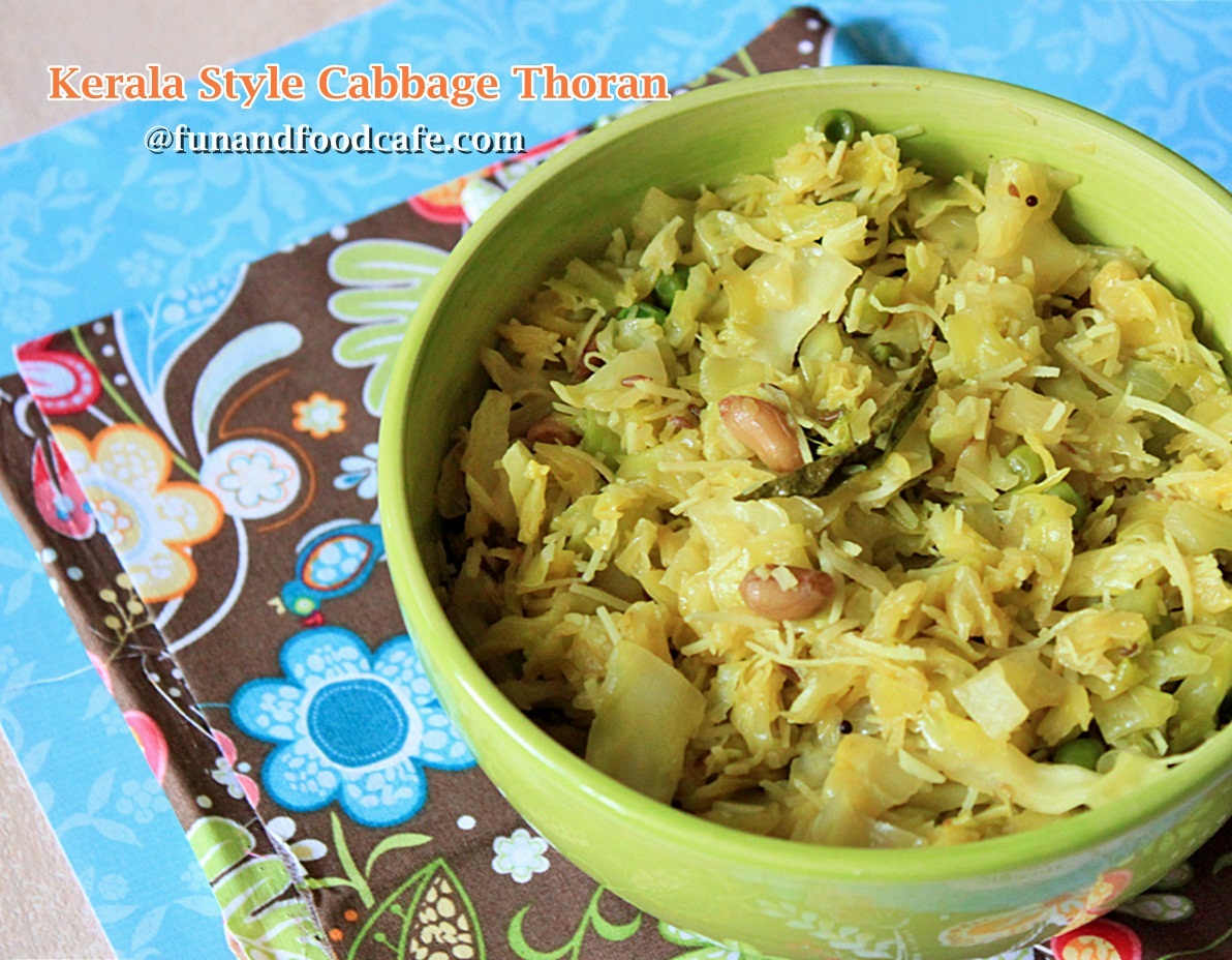 Thoran, (which may remind you of Thor or Zoran, but has nothing to do with it even remotely, except that if served to them, they would love it!), is a Kerala recipe made primarily with chopped vegetables like Cabbage, Spinach or Green beans, mixed together with grated coconut, mustard seeds, curry leaves and turmeric powder and briefly stirred on a pan over a very hot fire. I guess the idea behind the recipe was that its wuick and easy to make, uses mostly staple ingredients, and when served with steamed rice, it makes a complete and filling meal. In fact, you will find this served in several temples in India in the form of Prasad (offering to God).